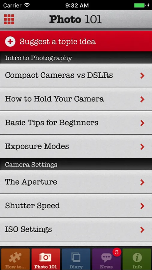 Photo Academy is a comprehensive guide to helping you take better photos. Browse through thousands of tips and sample images, record your progress in your diary, and expand your photography repertoire.