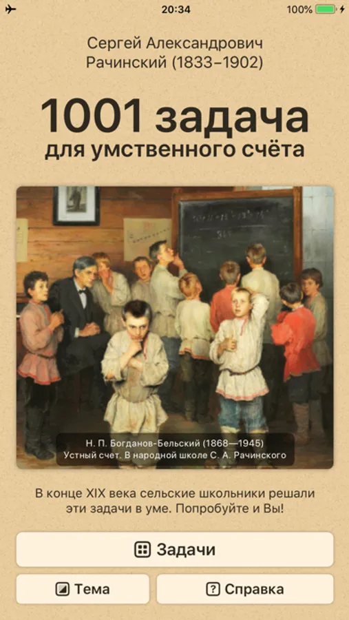 Приведены задачи из книги С.А. Рачинского «1001 задача для умственного счёта». Работа в уме с числами оказывает очень благоприятное влияние на развитие мозга человека. Наличие в пути iГаджета и отсутствие листочка позволит Вам заняться умственной гимнастикой. В конце XIX века сельские школьники успешно решали эти задачи в уме. Попробуйте и Вы!