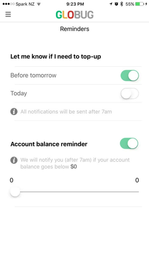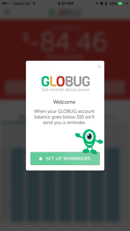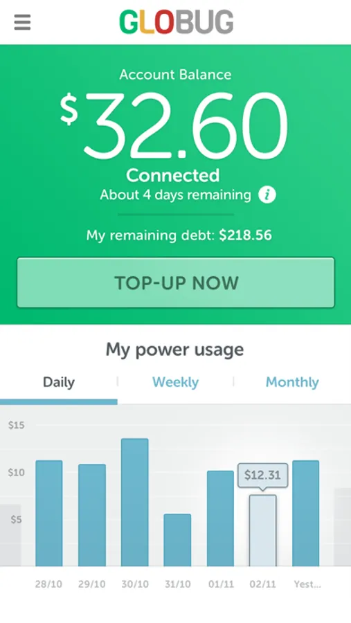 The GLOBUG app is a handy way to manage your GLOBUG prepay electricity account. The GLOBUG app allows you to view your account balance, Top-up your account with your Debit/Credit card or Internet Banking, see an estimate of how many days of power are remaining and to see how much you are spending on power; by day, week or month.