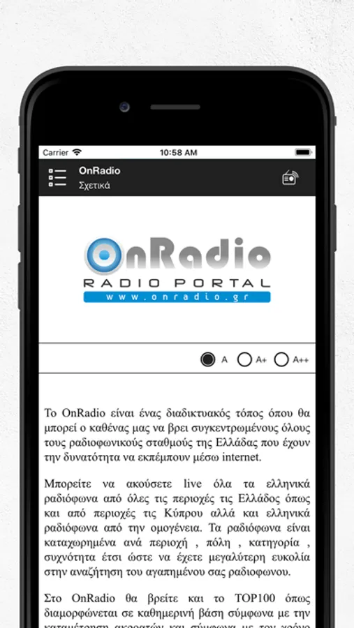 Το OnRadio.gr είναι ένας διαδικτυακός τόπος όπου θα μπορεί ο καθένας μας να βρει συγκεντρωμένους όλους τους ραδιοφωνικούς σταθμούς της Ελλάδας που έχουν την δυνατότητα να εκπέμπουν μέσω internet.