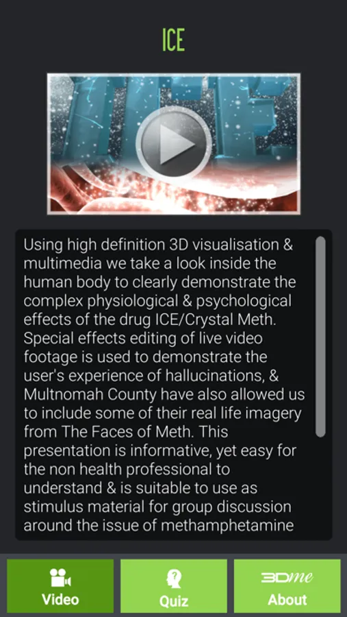 This 3Dme Community Health Education App explains the symptoms and consequences that the drug commonly known as ICE or crystal meth, has on the human body. A 9 minute video with captivating 3D animations, voiceover & graphics takes the viewer inside the human body to show how this drug is typically consumed, and what the physiological & psychological effects are. Consumption routes are intravenous, snorting, smoking or swallowing.