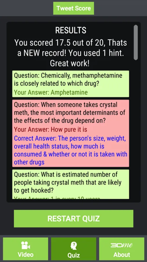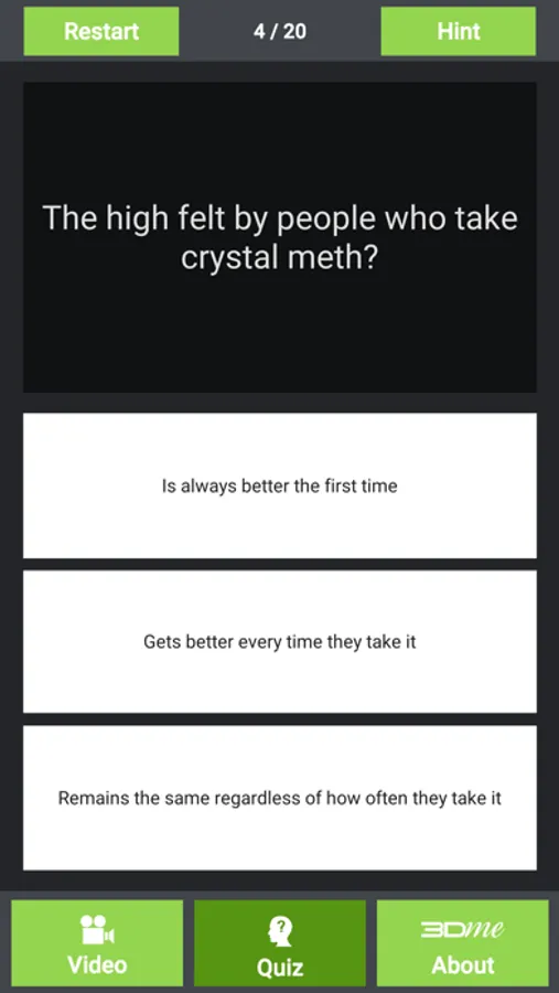 The presentation style is intended to be non-didactic, whilst also informing the viewer about the dangers of meth. This information will equip the viewer with a general understanding of why someone taking crystal meth behaves the way they do. Whilst our intention is to inform & educate young people, parents, teachers & health professionals about the dangers of crystal meth, we believe this information is also helpful to people who may have taken the drug & are trying to understand why they feel the way they do. Additionally, there is a question and answer section which the viewer can use to test their knowledge of this topic.