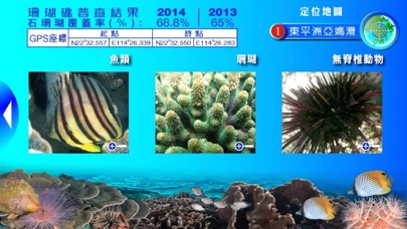 漁農自然護理署的「香港珊瑚礁普查」iPhone應用程式現已隆重登場,市民可透過這個應用程式查看香港東面水域33個普查點的珊瑚覆蓋率,以及48個指標品種包括造礁珊瑚、魚類和無脊椎類動物的分佈及相片。往後到這些珊瑚區遊玩時,不妨試試尋找在那兒居住的海洋生物吧!