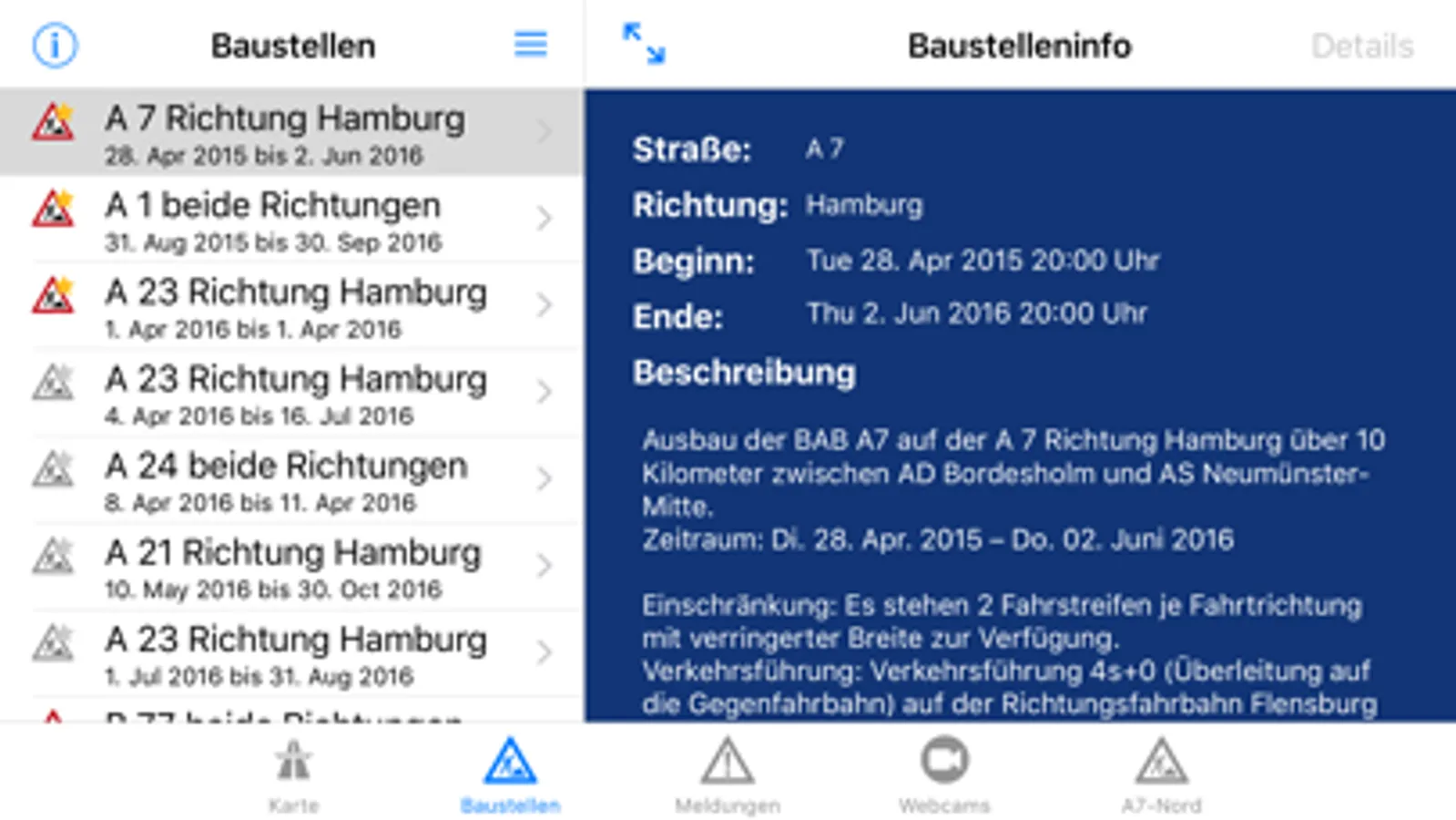 By tapping the roadworks symbol or a list item information (on traffic restrictions, brief description) are also displayed. Nor are details of what is happening on the site available, they are displayed in real time. Then the button is to tap "Details".