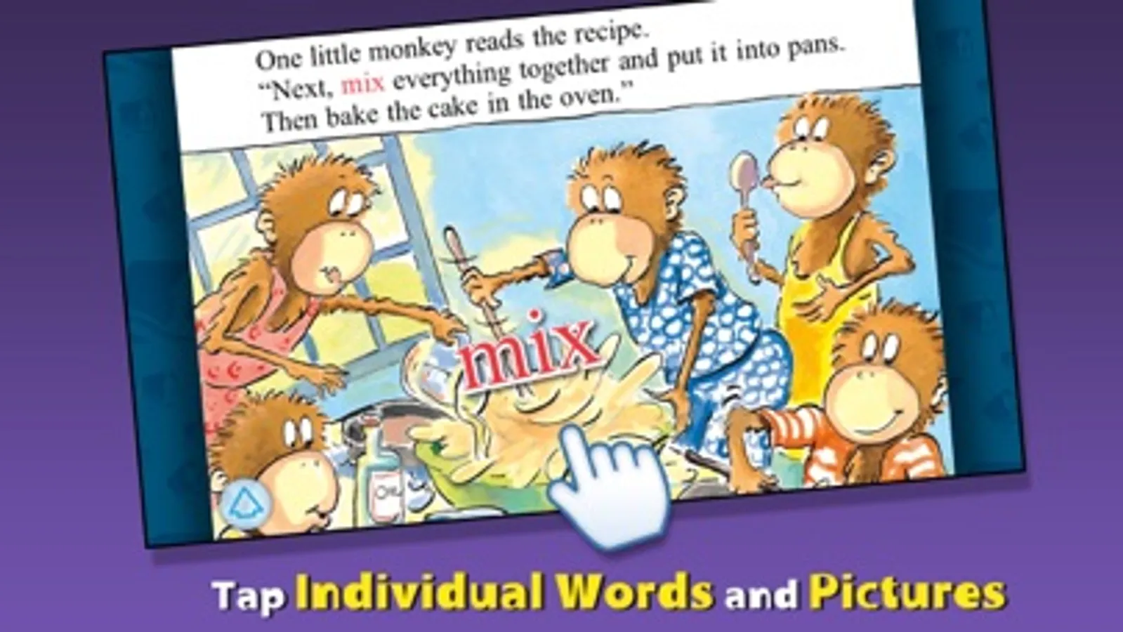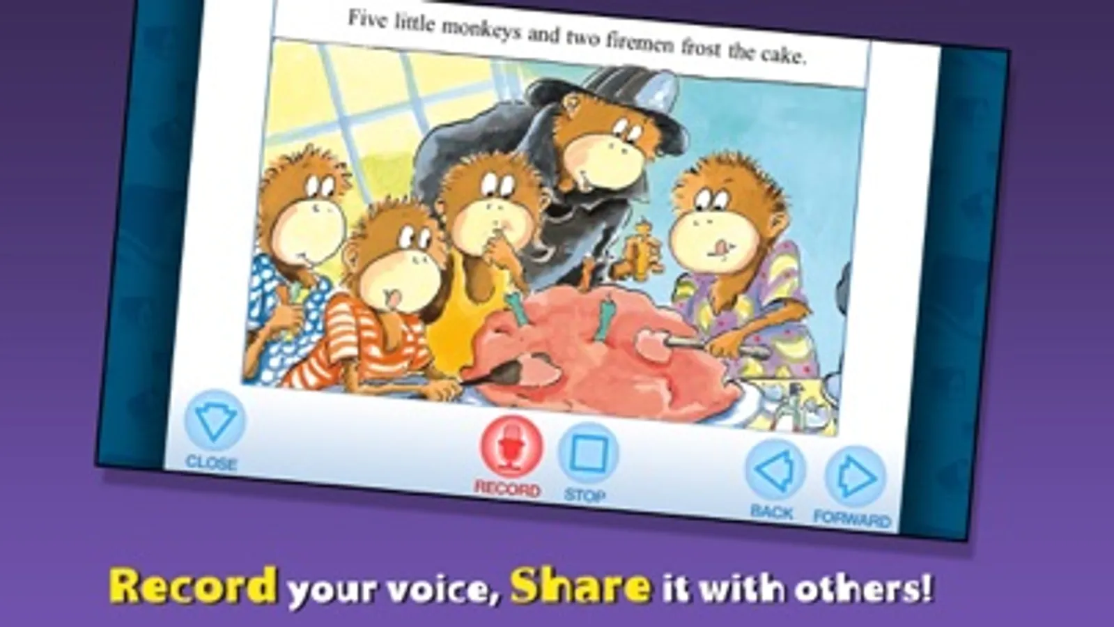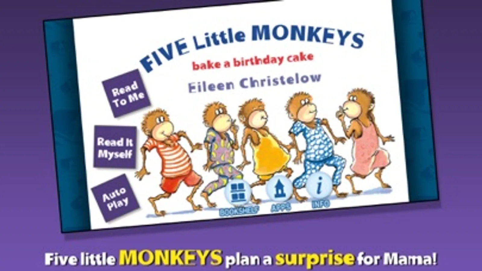 Join the Five Little Monkeys in this interactive book app as they wake up early to bake a surprise birthday cake for Mama! Explore pictures, learn new vocabulary, and personalize the story with your own narration. Will the Monkeys' rambunctious baking wake up Mama and spoil the surprise?