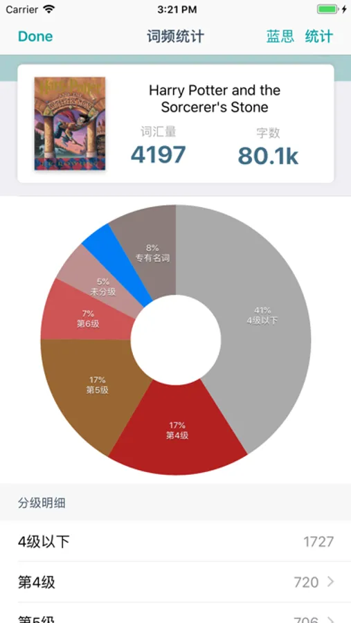 ● 詞頻統計: 統計壹本書中的詞頻分布以及總詞匯量, 了解閱讀難度。