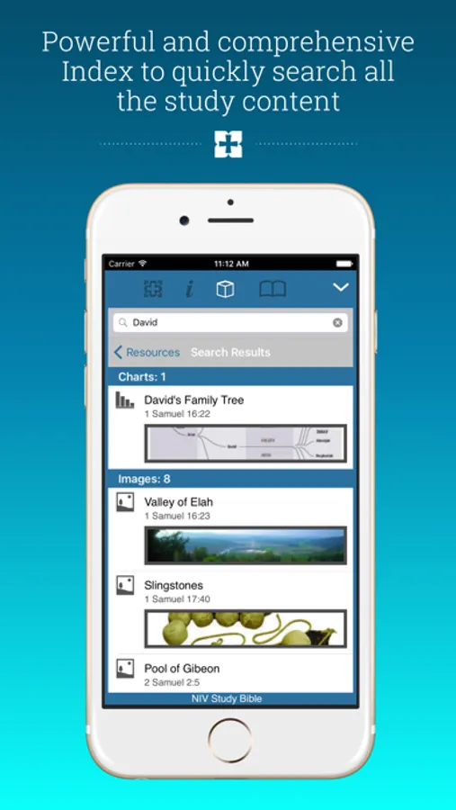 • Searchable index of topics, charts, maps, images, study notes, and complete Old and New Testaments allows you to find words or study content quickly and easily.