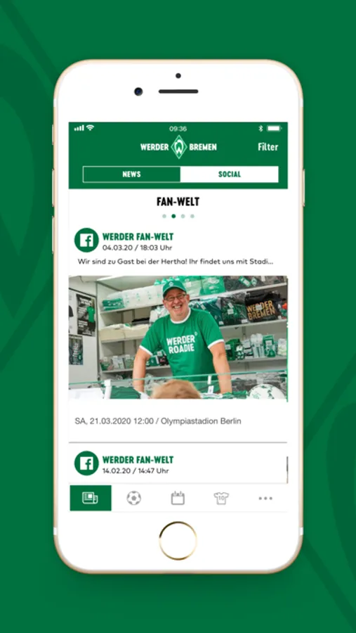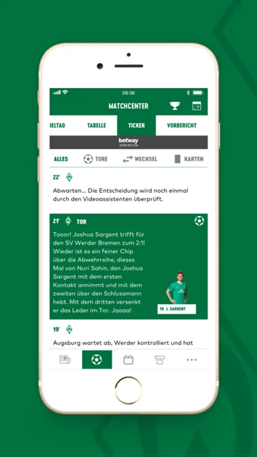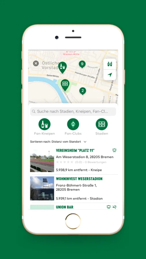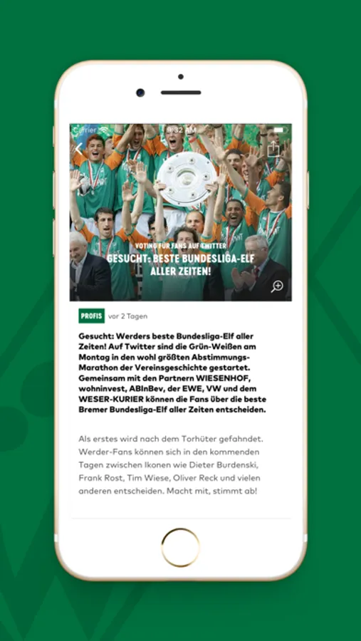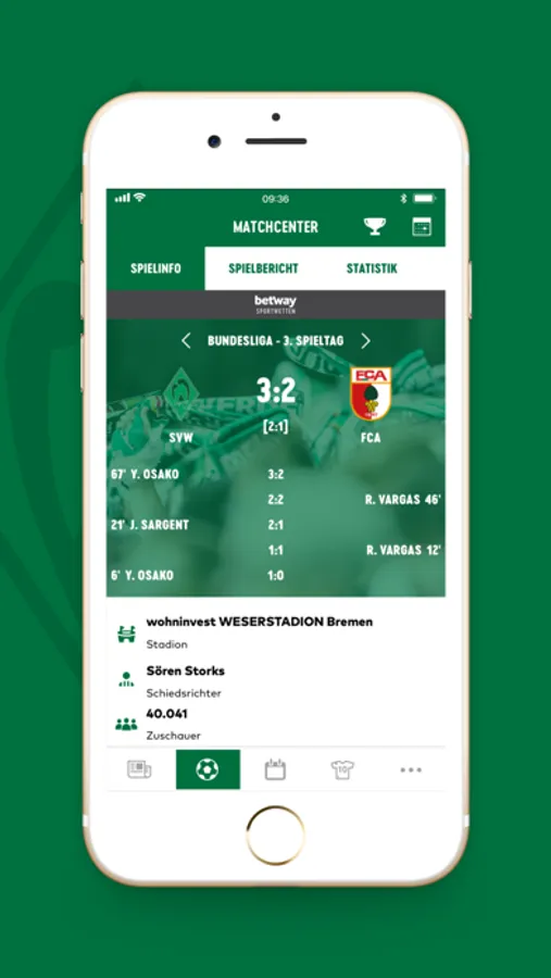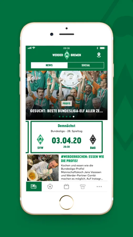 Die offizielle App des SV Werder Bremen liefert alles, was das Werder-Herz begehrt. Mit dem Matchcenter seid ihr als Fan am Spieltag immer auf Ballhöhe – hier gibt es neben dem blitzschnellen Live-Ticker inklusive Live-Spielständen auch alle Vor- und Spielberichte sowie umfangreiche Statistiken. Die brandneue Fan-Map bietet euch einen Überblick über Fan-Kneipen, Fan-Clubs und Stadien, Aktualität ist durch regelmäßig frische News und Interviews sowie die Einbindung der offiziellen Social Media-Kanäle garantiert.
