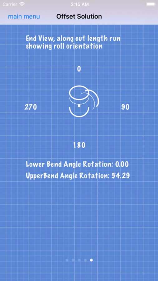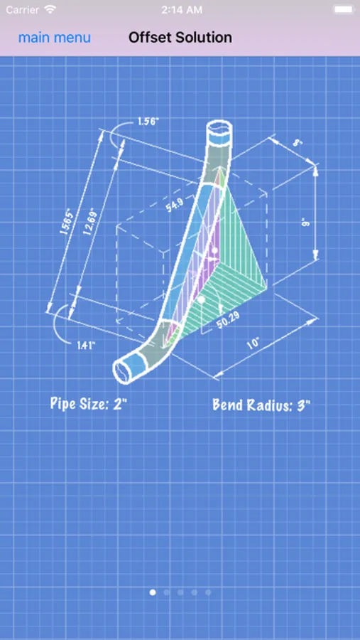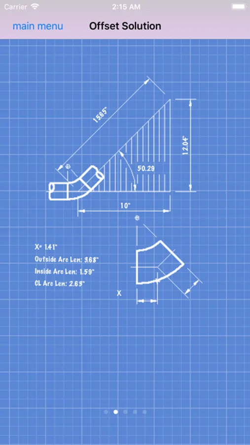 The user is presented with the solved graphical representation of the offset. The complete graphics include multiple solution views which provide clear, graphical, design and fabrication data. All bend angles, tangents, cut lengths, rise, run, hypotenuse, miter angles, roll angles, inside and outside arc lengths of mitered ells, etc are presented.