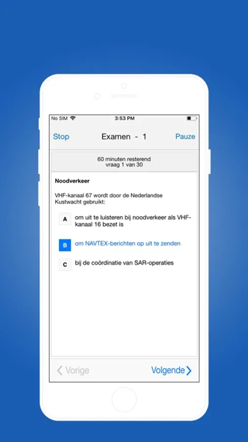 Met de iPhone app ‘Examentraining Basis Marifonie’ kunt u oefenen voor het examen voor het Basiscertificaat Marifonie. Het Basiscertificaat Marifonie is het officiele bedieningscertificaat om een binnenvaart marifoon te kunnen gebruiken. Dit bedieningscertificaat heeft u nodig als u een marifoon en/of AIS zend- en ontvanginstallatie aan boord van uw schip heeft en is bedoeld voor zowel plezier- als beroepsvaart. Als u de marifoon alleen gebruikt op de binnenwateren kunt u volstaan met het basiscertificaat.