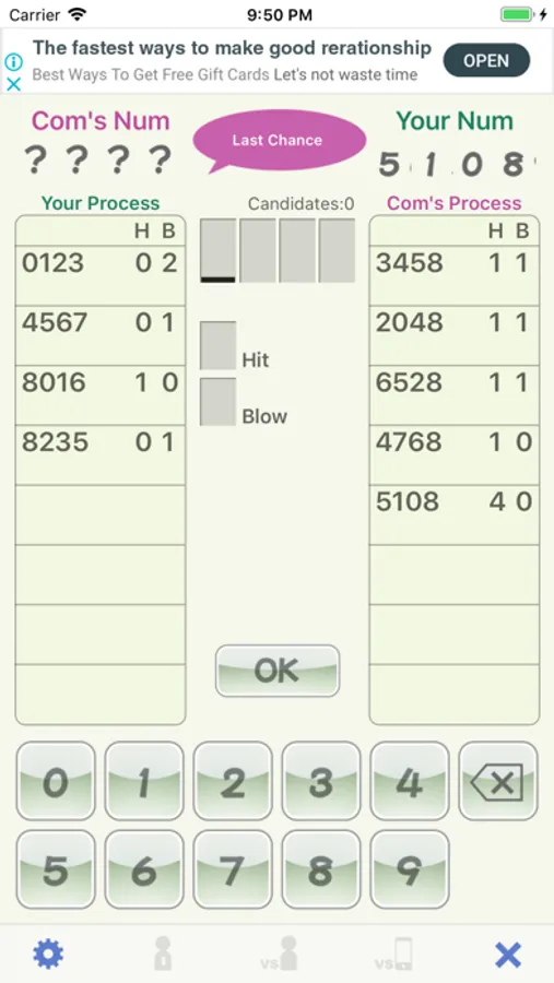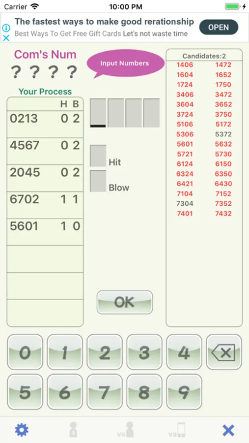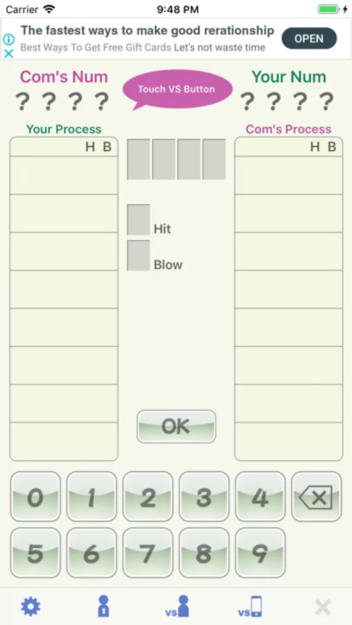 Guess 4 digits. The game system compares it with opponent's digits. If there are same digits on same place, the system judges "Hit". If there are same digits on different place, system judges "Blow".