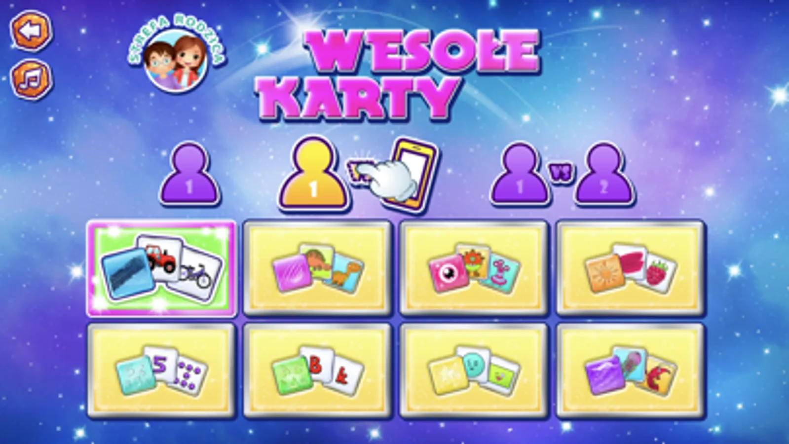 WESOŁE KARTY mają plansze z obrazkami w kilku różnych kategoriach do wyboru: