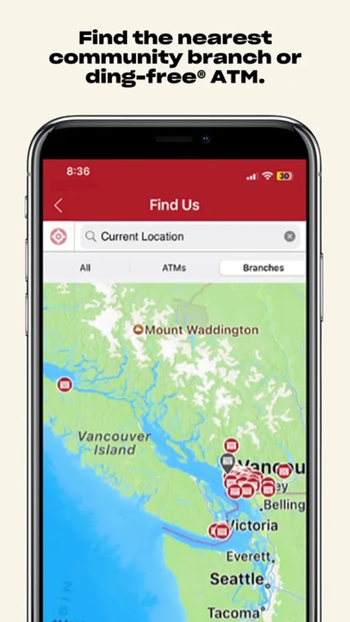 Enjoy ding-free access to over 4,000 ATMs Canada-wide including all credit union ATMs. Locate one of our community branches or ATMs in the app.