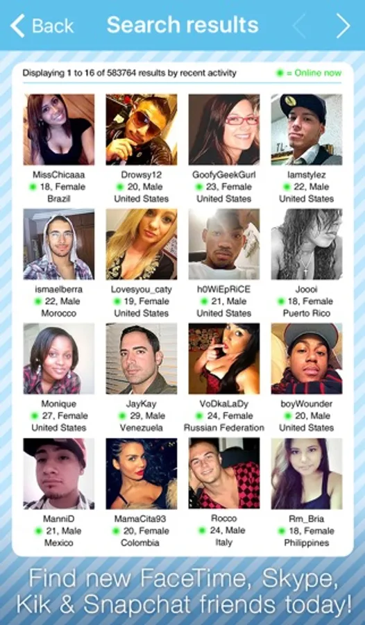 Join, search and contact over 350,000 FaceTime, Skype, Kik & Snapchat users around the world for FREE!