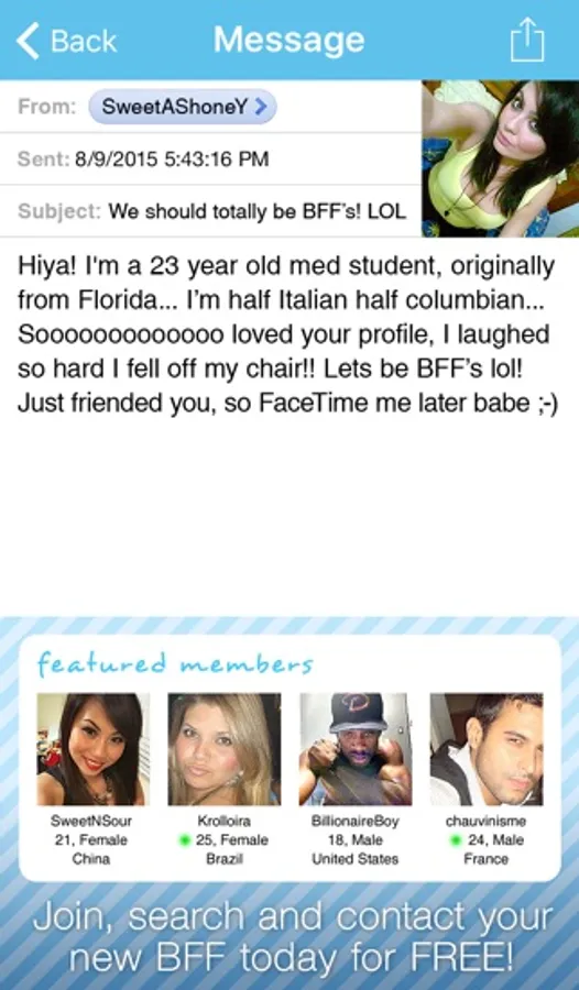 Video Chat Best Friend Finder is the largest FREE social network connecting FaceTime, Skype, Kik & Snapchat users around the world in a fun, safe and private community. Only YOU control when contact details are exchanged, this is NOT a random "chat roulette" network.