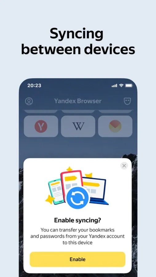 Access your favourite websites and bookmarks on any of your devices – just allow syncing of your data via your Yandex account.