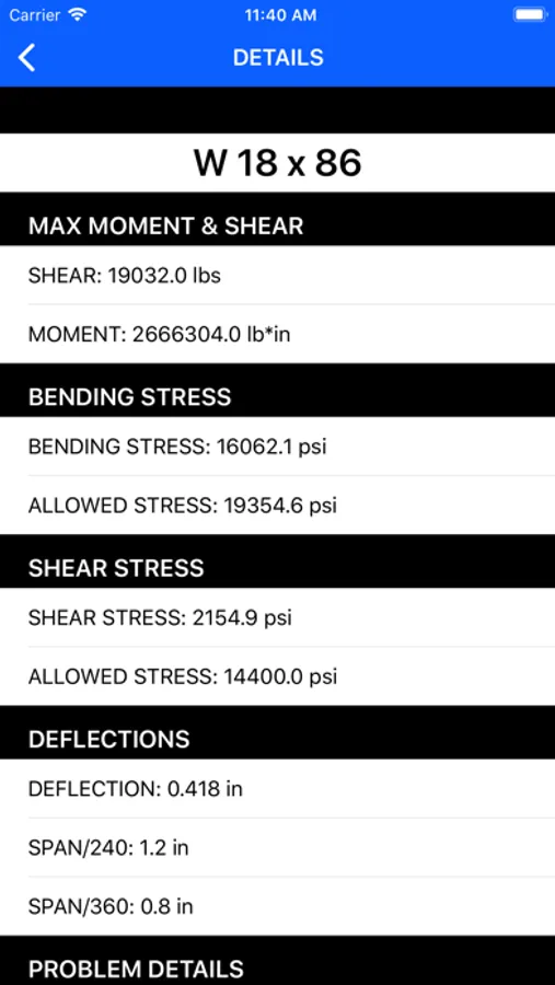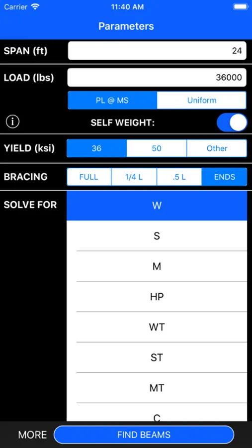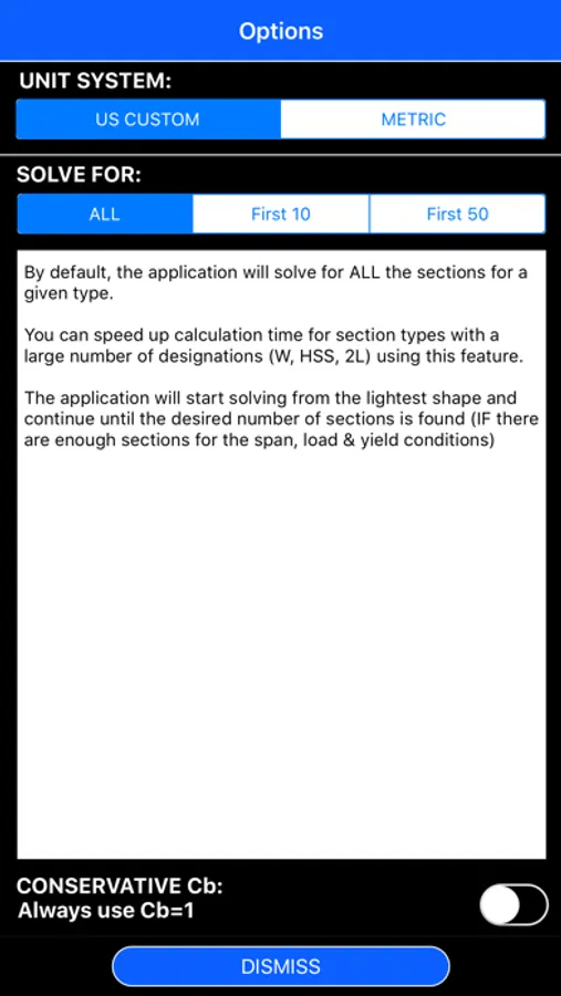 - Solve for All, first 10 or 50 sections for a given type (in increasing weight order), saving calculation time for shape types with a large number of designations (W, HSS, 2L, etc)