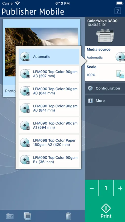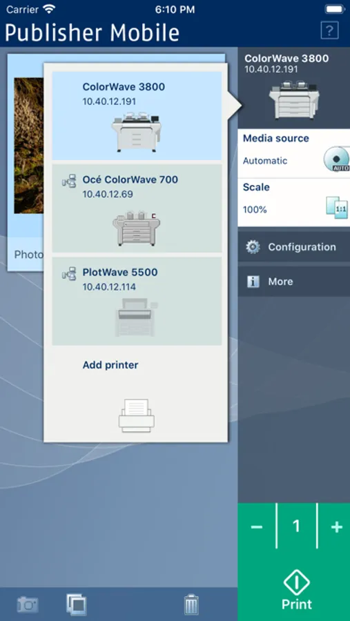 With Publisher Mobile, you can print your PDF, DWF, PLT (HP-GL, HP-GL/2, HP RTL), JPG, and TIFF documents to Océ plotters. Reprint your documents, scale your plots, access the main settings, view the queue, media and ink/toner status of your plotter at any time. Available in 20 languages.