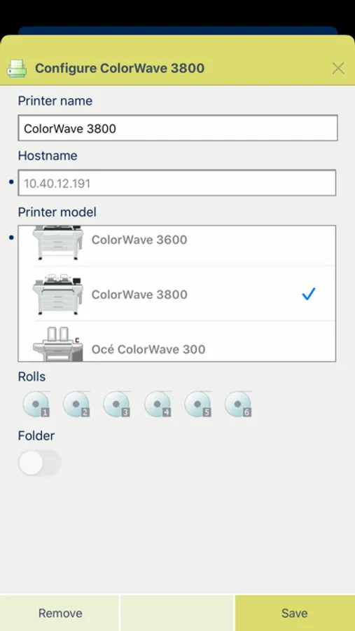 Enter the IP address or hostname of the printer > Give it a name > Check or define the printer model > Define the number of rolls > Indicate if there is a folder > Add / Save > Ready!