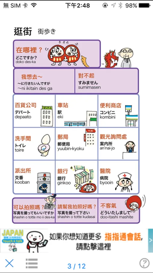 只要點擊畫面,即可反覆聽到真人日本語,讓你不論在旅遊時或在學習上都可方便使用。