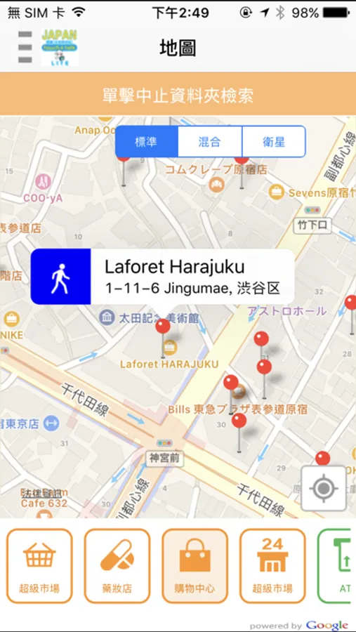 不只可搜索超市、藥妝店、便利商店、銀行、醫院、警察局、車站、餐廳、住宿地(飯店)、遊樂園和公園外,還可查詢路線。