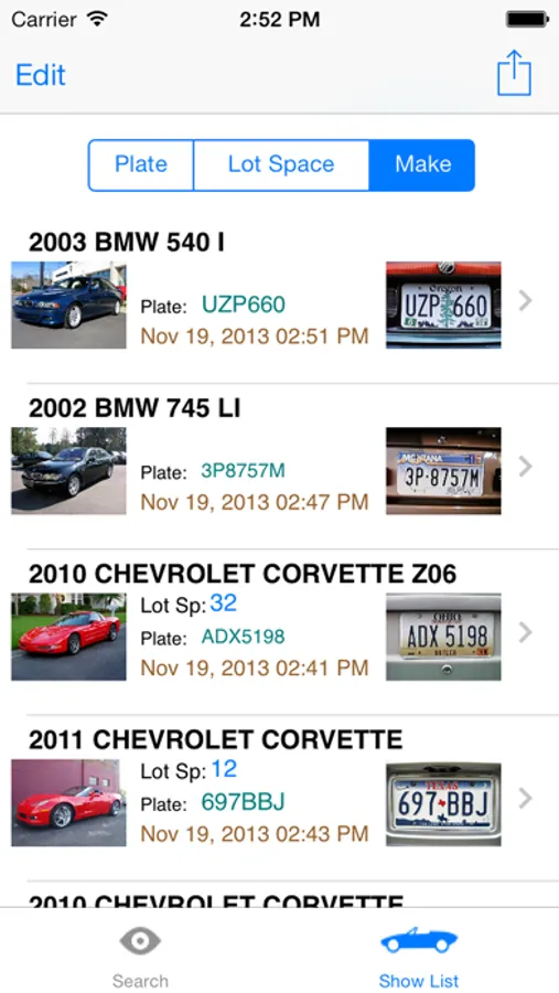 The list of vehicles is displayed in a table with thumbnail photos and can be sorted by plate number, car make, or parking space identifier for quick review. A vehicle’s complete record can be displayed and edited by tapping on any entry on the list.