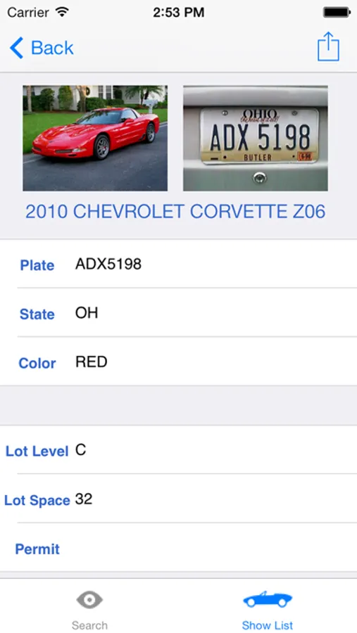 If the VIN is scanned or entered, Parking Lot Manager will automatically identify the Year, Make, Model and Trim for the newly discovered vehicle. Additional information can be added such as color, plate number, parking space number and a detailed note. A photo of the car and/or license plate (or the car’s owner) can be added. A one-touch in/out time stamp is available to track arrival and departure times if desired.