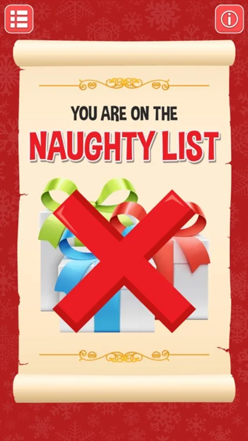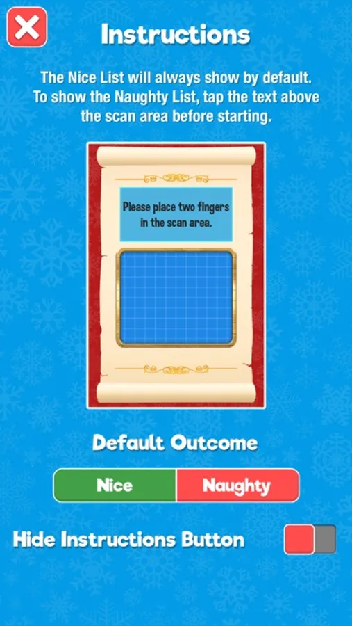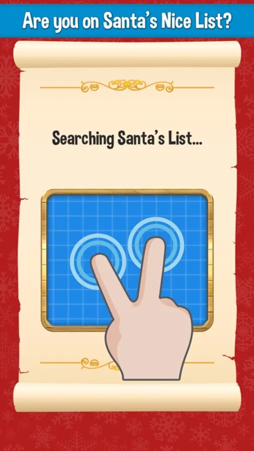 To use the app, simply place two fingers in the scan area. The app will then search Santa’s List and let you know which list you are on. The Nice List will show be default but by pressing the secret hidden button, you can have it show the Naughty List.