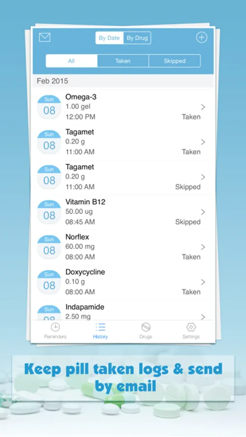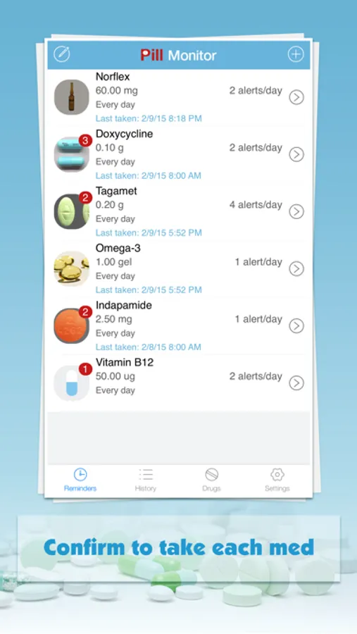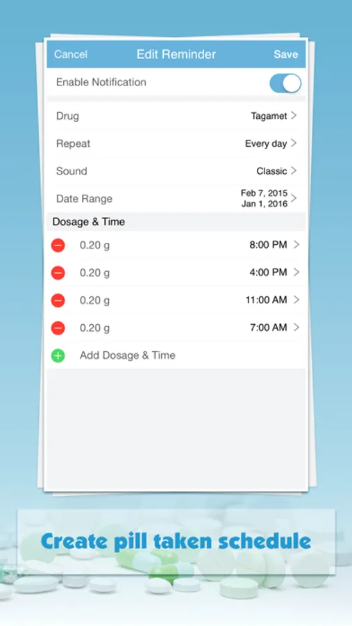 ⁃ Choose to take, skip or snooze pills when it reminds.