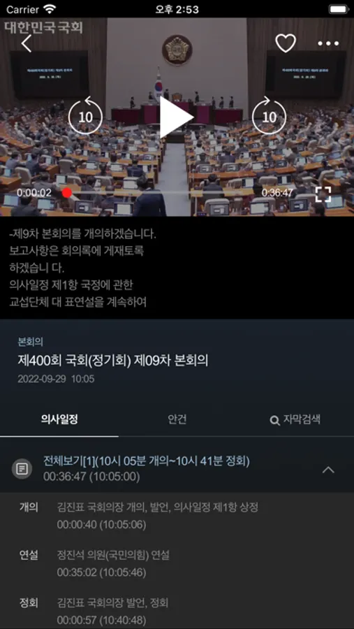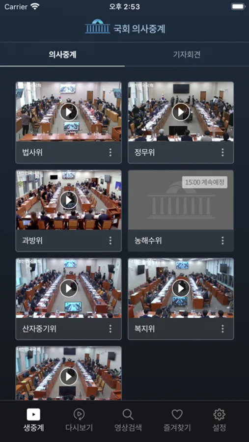 국회의사중계 앱은 국회의 회의를 스마트폰으로 시청할 수 있는 어플리케이션입니다.현재 인터넷의사중계시스템으로 서비스하고 있는 모든 회의 영상을 스마트폰을 통해 시청할 수 있으며, 생중계된 회의에 대해 다시보기 서비스를 제공합니다.