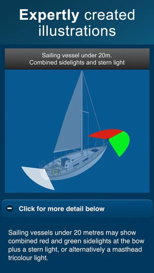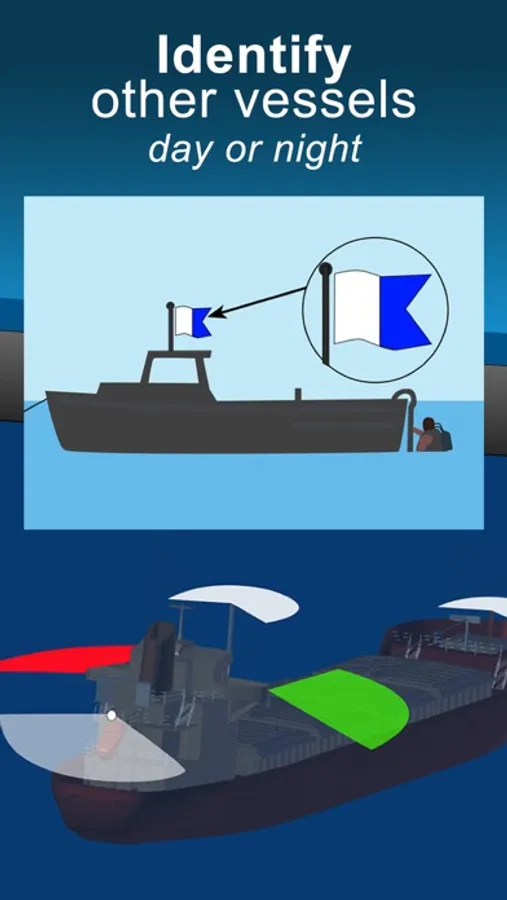 Quick learning & revision tool, over 100 graphics, for all seafarers - this sailing, boating & marine app provides all sailors, boaters & fishermen with essential quick reference knowledge to help them identify vessels and the activities they are engaged in, as specified by the ColRegs.