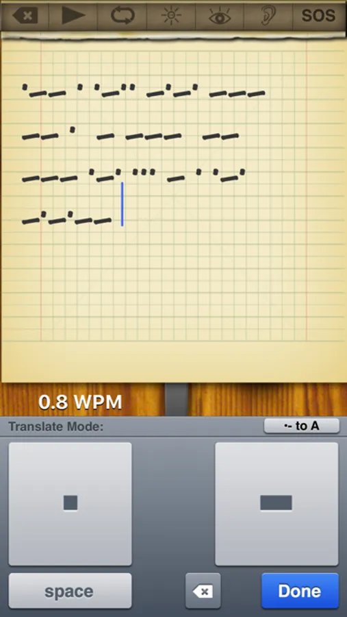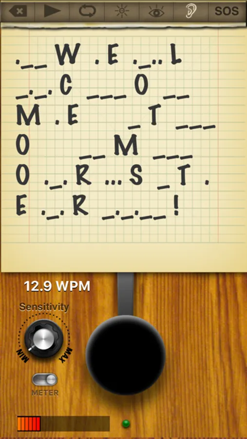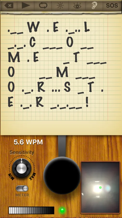 Morster can use the live camera feed to decipher morse code that is being signaled with light. The light source could be coming from a light, mirror or another version of Morster. Use the view finder to focus on the light source, adjust the sensitivity and the morse code will be translated and displayed in the notepad.
