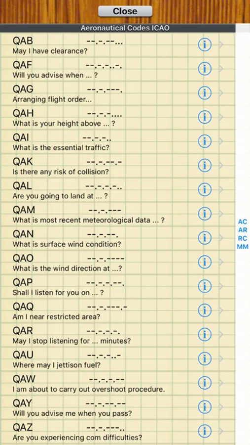 A list of morse code characters is provided in list form or as a sticky near the morse key. A list of Prosigns and QCodes are included. These are sequences of letters that have special meaning in different morse code applications. For example SOS = ...---... = Distress Message.