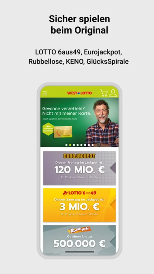 Aren’t you just loving to play with the original? Welcome to WestLotto! In the WestLotto App you can find LOTTO 6aus49, Eurojackpot, Scratchcards, KENO, GlücksSpirale and the additional lotteries such as Spiel 77, SUPER 6 and plus 5. Simply choose the lottery you want, type in your lucky numbers and submit the ticket directly in the App.