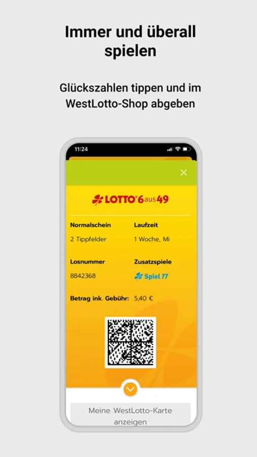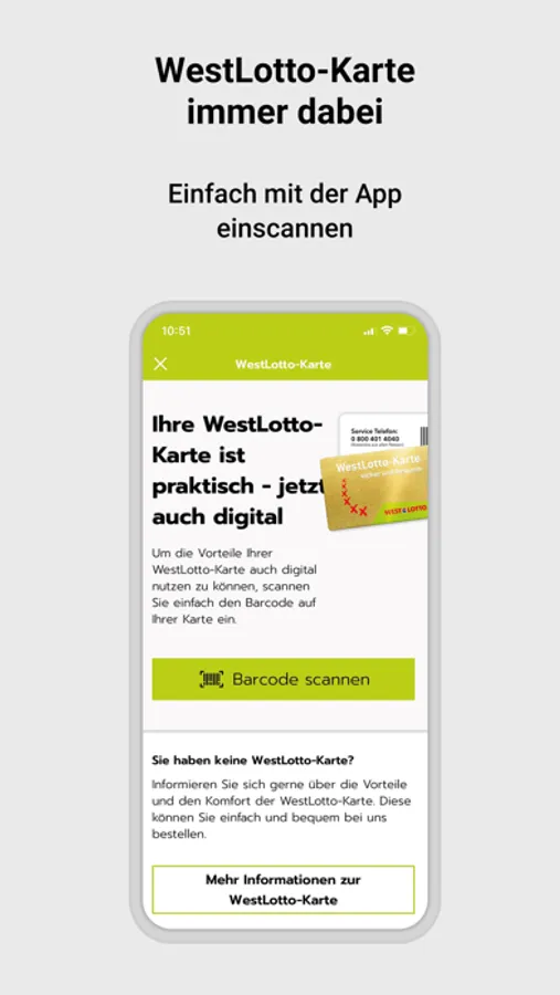 Old school is also cool: Do you prefer to buy your ticket at a WestLotto-Shop? No problem! On your way to the Westlotto-Shop, you can fill out everything in the App and simply show the barcode in the shop to get your ticket. Do you have a WestLotto customer card? Great! After you scan the card using the App, a digital version is now available so you can show it in your mobile phone, together with your winning smile, at the Westlotto-Shop.