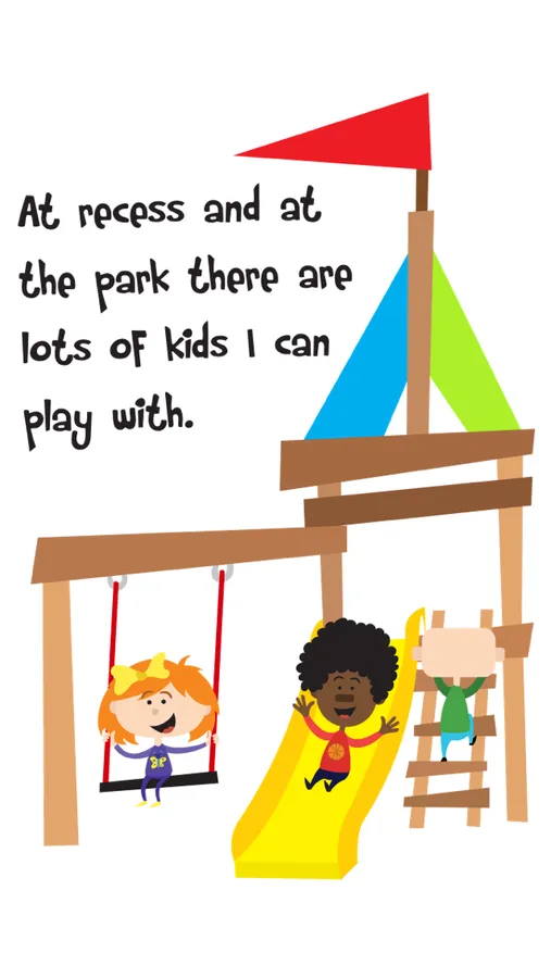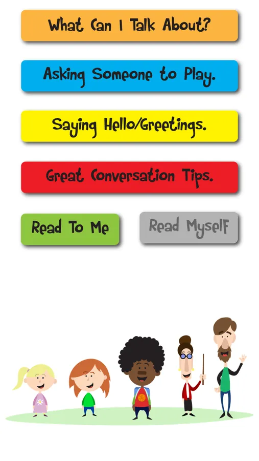 The app opens up to table of contents to choose which of the four stories to read. Some of the stories have buttons that play examples of things to say when each one is pressed. The stories focus on important conversational skills including greetings, asking someone to play, tips on where to stand, how to end a conversation and many more!