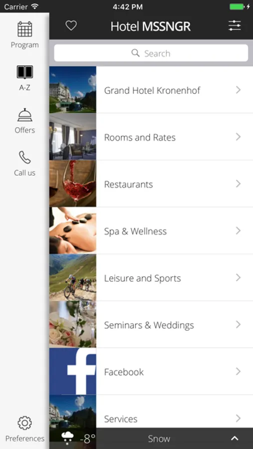 Hotel MSSNGR is a guest communication app for hotels to let their guests decide about what, when and where they want to be informed. Hotel MSSNGR is an easy to use iPhone app, which delivers information about activities and events right to the iPhone of the hotel guest. All information is automatically filtered by the personal and individual interests of each hotel guest.