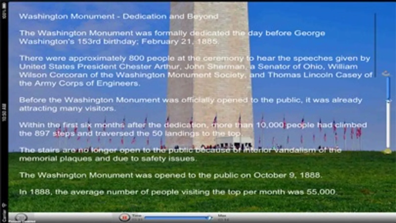 This iSmartGuide app was also designed with virtual traveler in mind. It is feature rich with maps, audio tracks, viewable transcripts, and photographs organized with a thumbnail viewer. It also includes both a serial and random slide show and a thumbnail viewer of 800+ images. Users are empowered to explore the National Mall and enjoy an amazing learning experience without ever leaving the comfort of their home or classroom. For the virtual tour enthusiast who is less concerned about portability, the iPad version of the app delivers an extraordinary user experience and is highly recommended. This is an ideal app for use in the classroom to help students learn about the many wonders of the National Mall and the Capital of the United States of America.