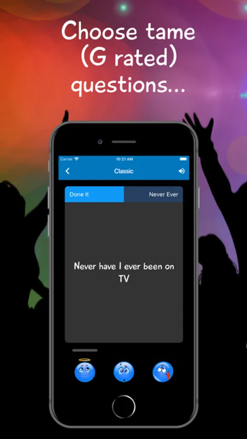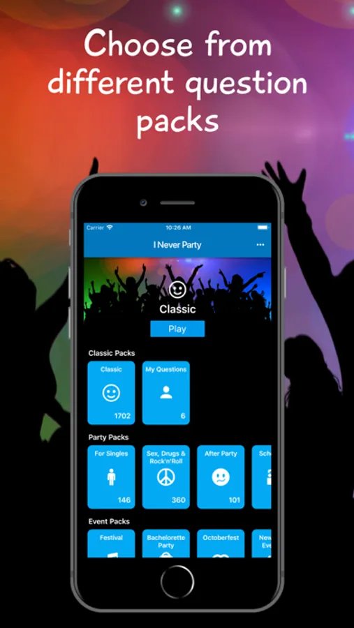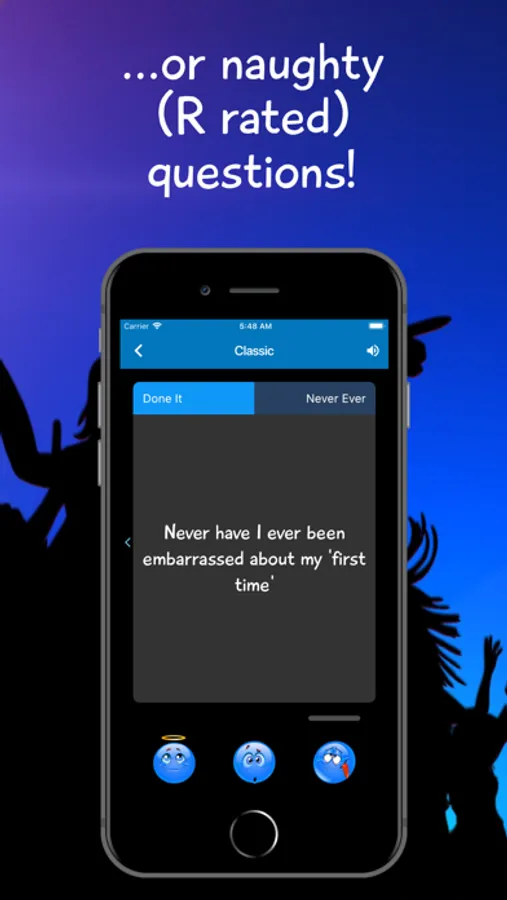 The app contains over 2,000 questions: tame, sexy, clean, dirty, wild, flirty and crazy I Never questions. Play the Classic version or choose a themed question pack for a special occasion (e.g. Festival, Girls Night, For Singles, For Couples, After Party...).