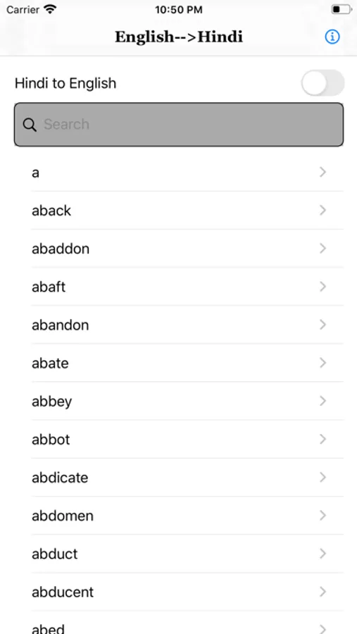 Best english to hindi dictionary in the market. It has more than 35000 english words with hindi meanings, synonyms and antonyms. It has voice enabled pronunciation for english words and doesn't need internet connection. Predictive searching will make your life easier.