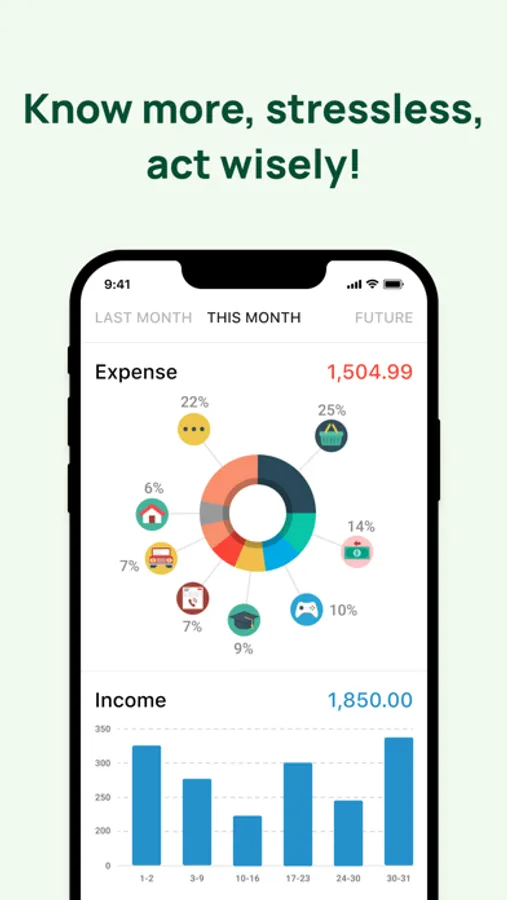 Keep track of your expense, income, debt, bill and payment within few taps on screen. It's quick, simple and fund. You will better understand where your money comes and goes with easy-to-read reports such as: total expense, total income, spending by each category or pending bills.