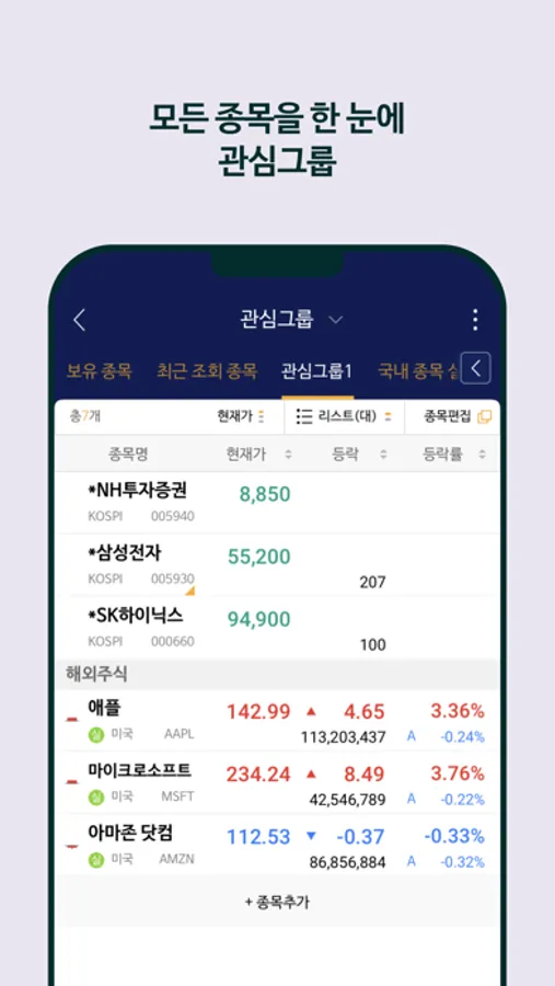 관심그룹에 등록한 지수와 종목을 확인할 수 있어요!