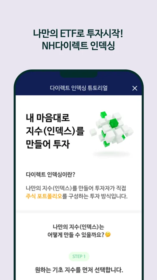 NH전문가 추천 인덱스도 제공하고, 나만의 지수를 만들어 직접 주식 포트폴리오를 구성할 수 있어요.