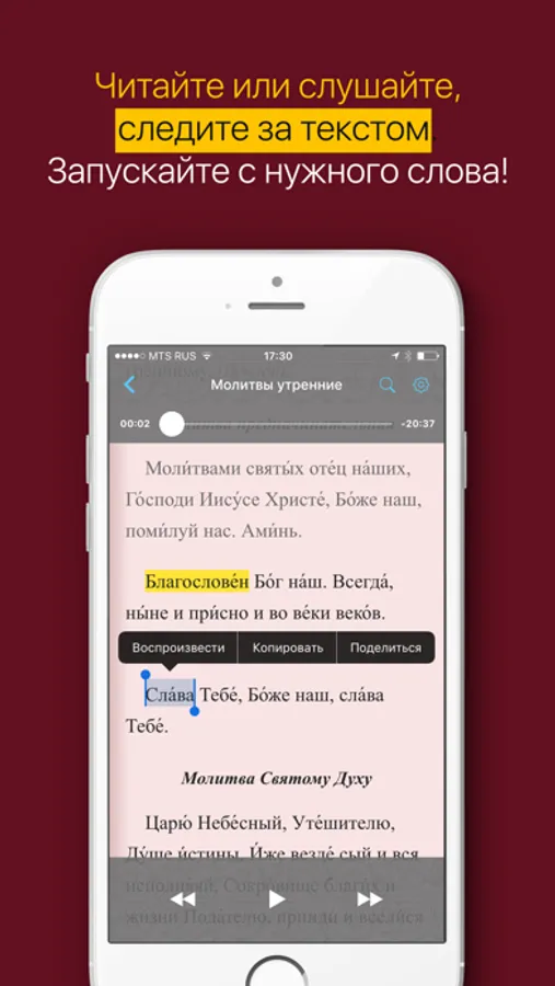 ・Воспроизведение с выбранного слова при помощи долгого касания;