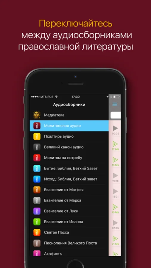 ・Легкое переключение между православными аудиосборниками через выпадающее меню;