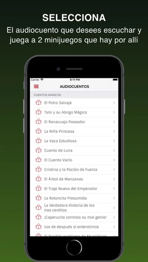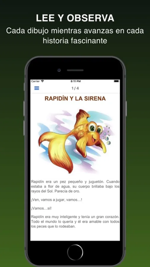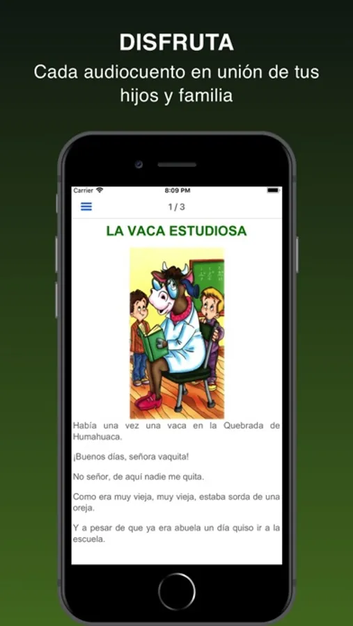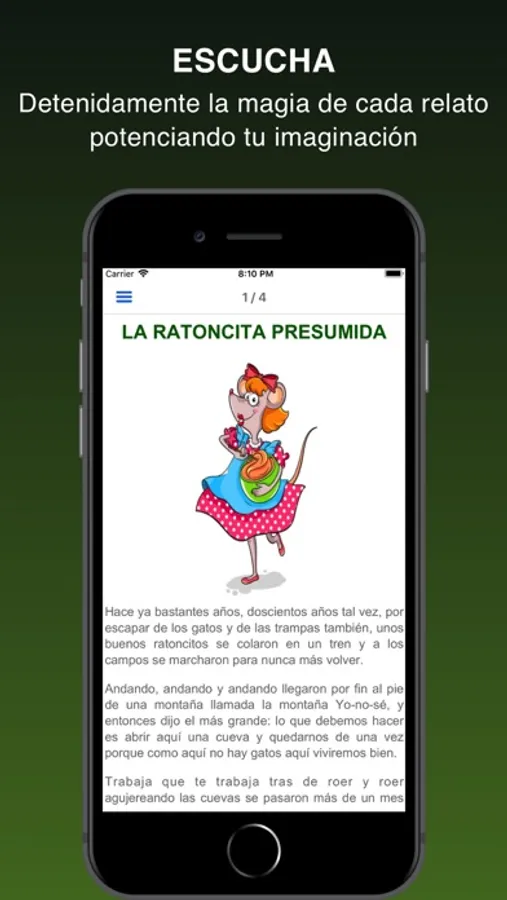 Esta App ha sido diseñada con una sencilla interfaz para la pronta y fácil reproducción y lectura de las historias.