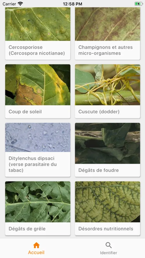The Di@gnoplant®-Tabac application, interactive and easy to use, makes it possible to visually identify about a hundred diseases and bioaggressors of this solanacea in cultures, at the dryer, during storage, or even in the laboratory, and to manage them. This application works in 3G, Edge and wifi mode.