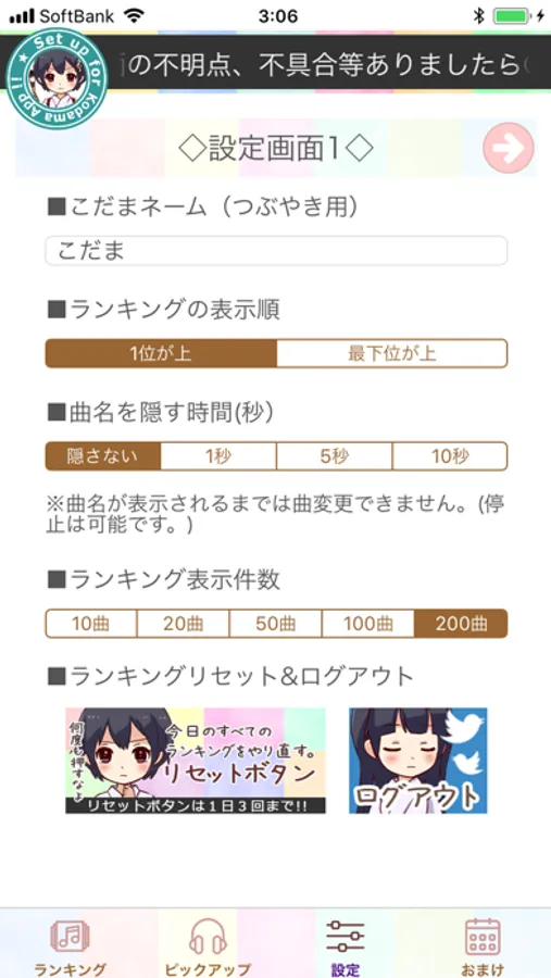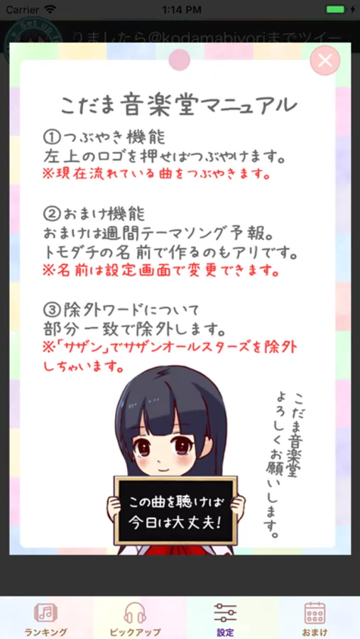 1位の曲をつぶやけるようにつぶやきボタン設置しました。つぶやきには「こだまのゆる〜い心得」もつけてみました。