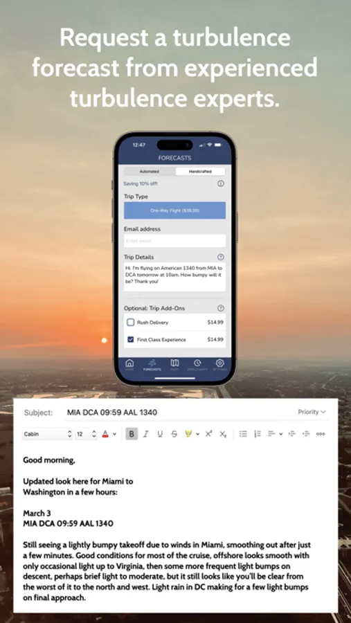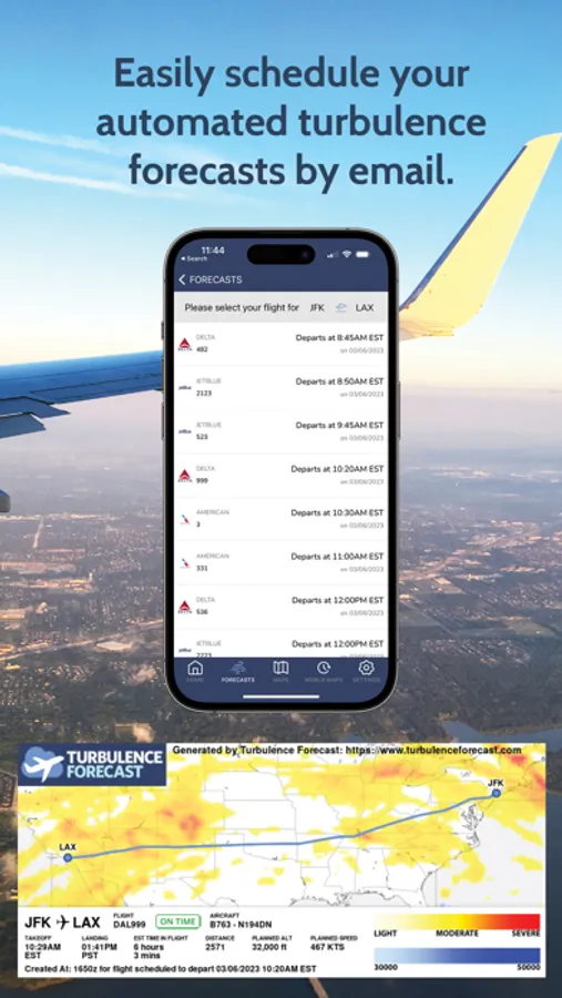 How turbulent will your flight be? With the Turbulence Forecast app, quickly and easily find out with our new and easy to understand world turbulence map, automated turbulence forecasts tailored for your flight, and our original handcrafted forecasts by email - written by turbulence experts with over 20 years of experience.