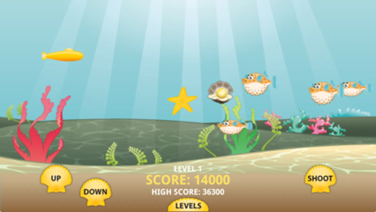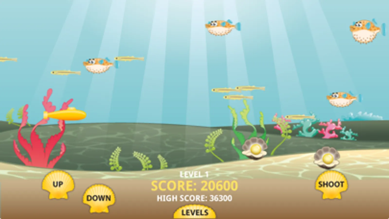 Puffer Fish is a classic side scrolling shooter style game with an underwater theme. Help defend your sub against the Puffer Fish. The goal of the game is to shoot as many of the Puffer Fish as you can to unlock the next level and get a high score. Shooting 10 shots in a row without missing releases a bonus starfish that you can shoot for bonus points. You have to shoot a puffer fish 4 times to kill it. Shooting a puffer fish that is puffed out will release whatever item(s) it has in it.